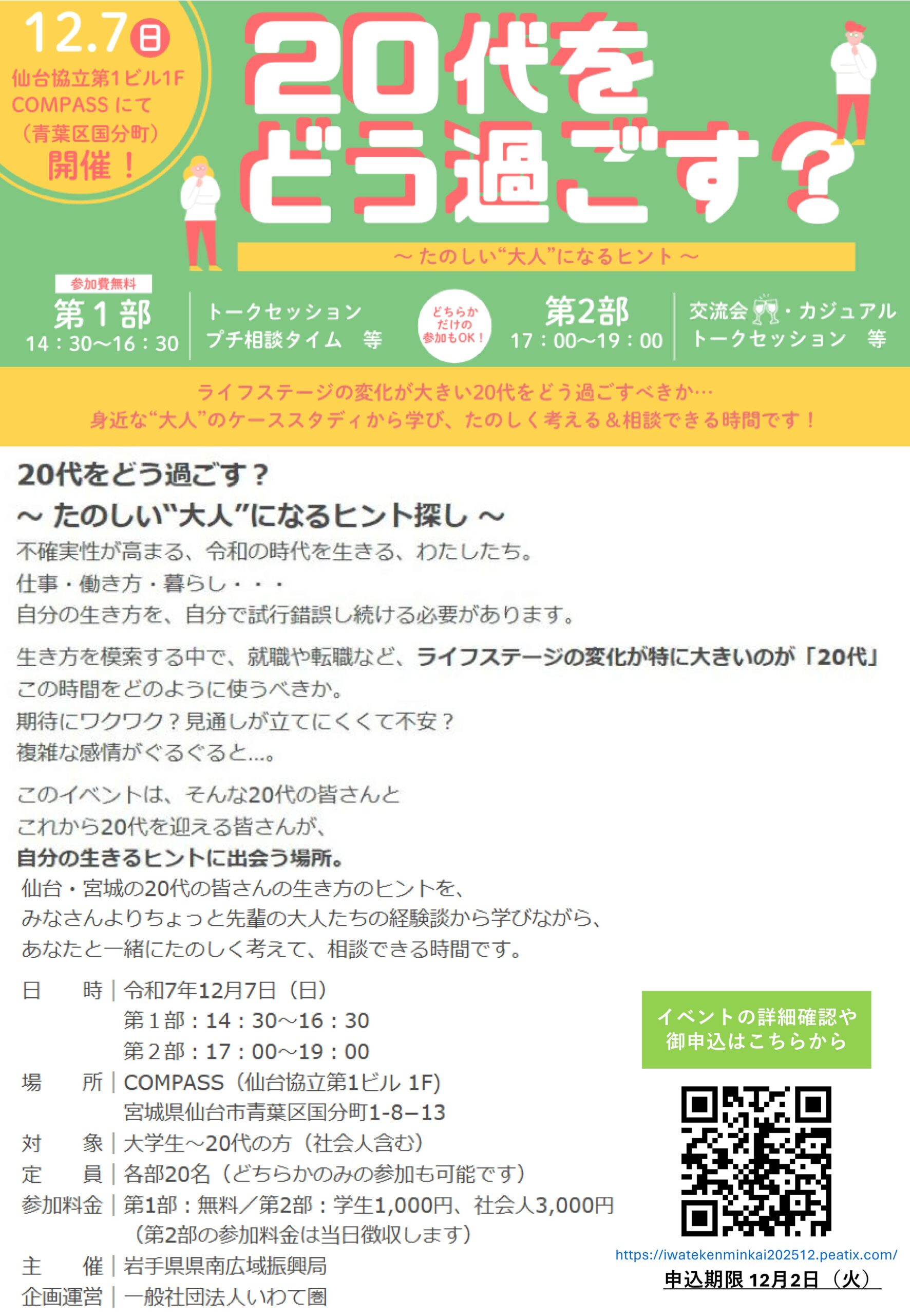 【12/7(日)仙台開催】南いわて×仙台交流イベント「20代をどう過ごす?~たのしい“大人”になるヒント」